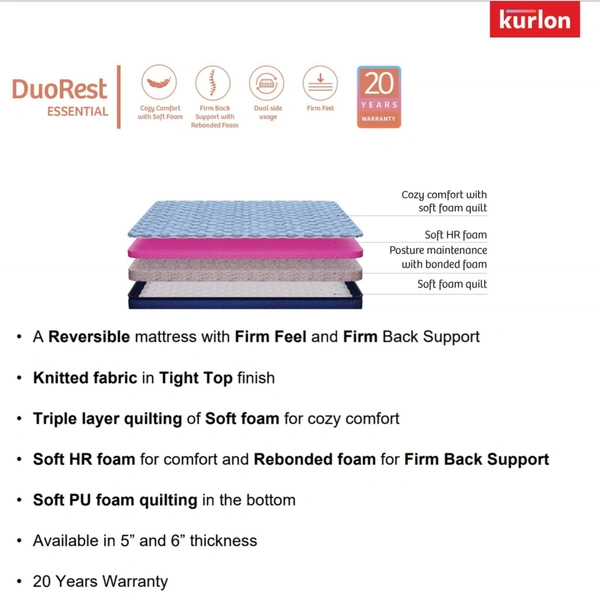 Kurlon Duo Rest Essential Mattress Best Orthopedic Mattress in India from Ahmedabad at best Price Shop Kurlon DuoRest Essential Bonded foam mattress review in India buy Online or from Ahmedabad Store.