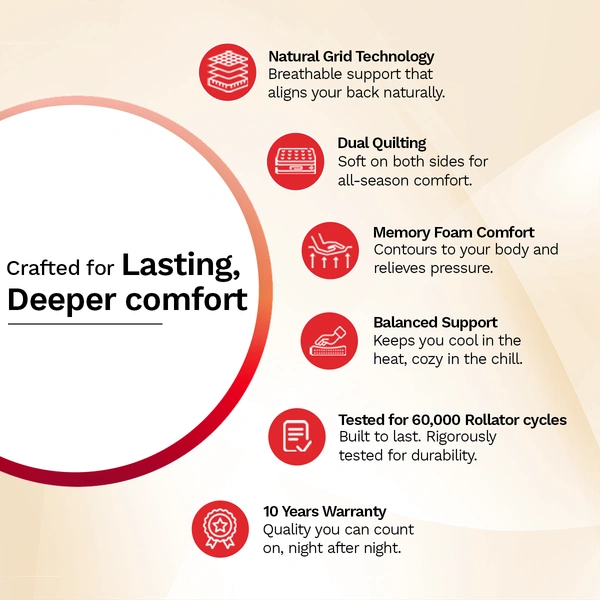 This mattress supports more than just your back. It supports the way you rest, recover, and rise. The Kurlobond Premium Mattress by Kurlon combines firm, breathable support with indulgent comfort. Its natural coir grid promotes spinal alignment, while soft foam quilting offers plush ease. Wrapped in high GSM knitted fabric and reinforced with rebonded foam, it delivers the ideal balance of softness and structure. Crafted for deeper rest and lasting comfort.